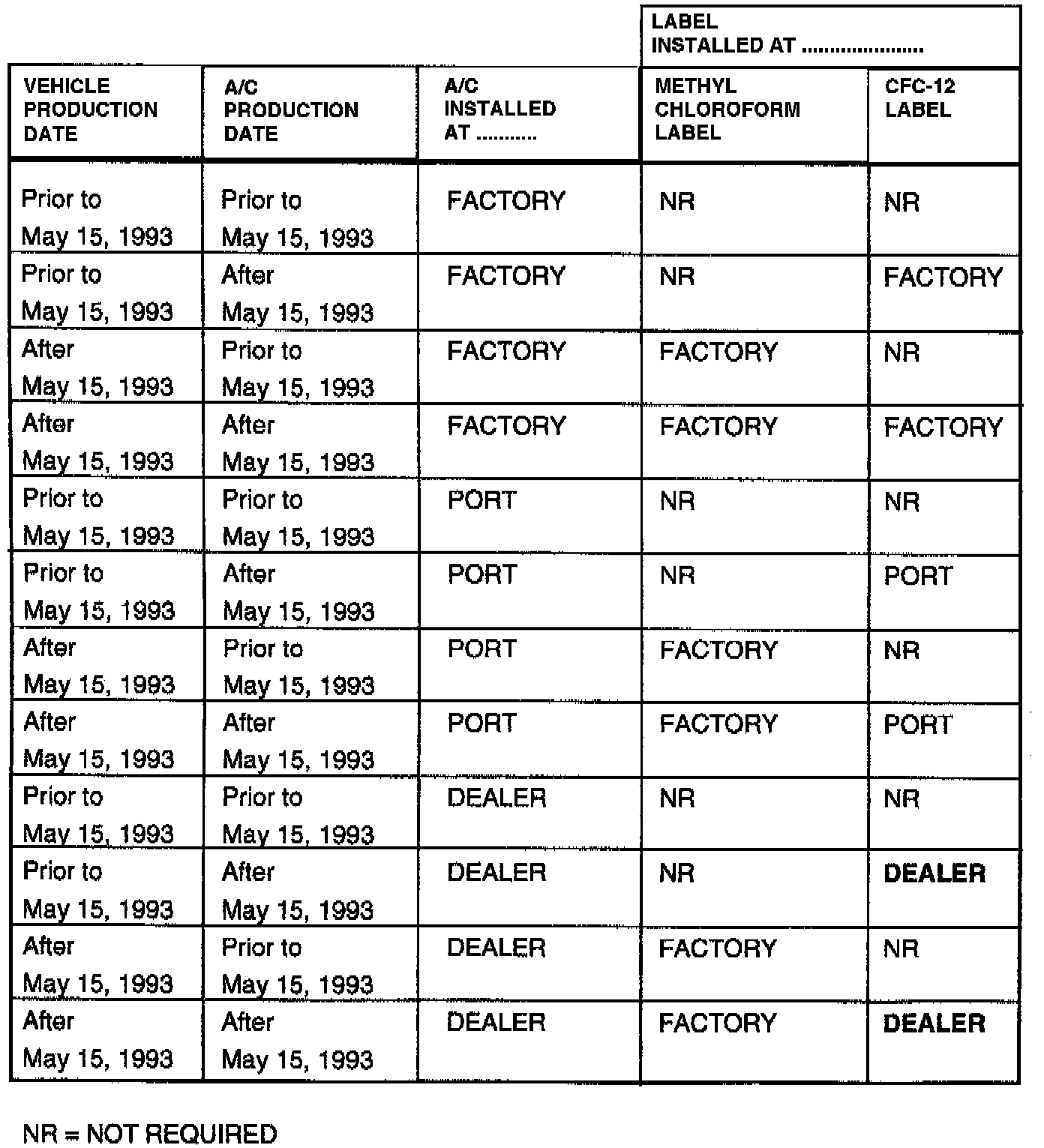 Vehicles with port or dealer installed A/C will have the CFC-12 Caution Label applied at the, A/C kit installation location. The CFC-12 Caution Label is ONLY required for A/C kits manufactured after May 15, 1993.