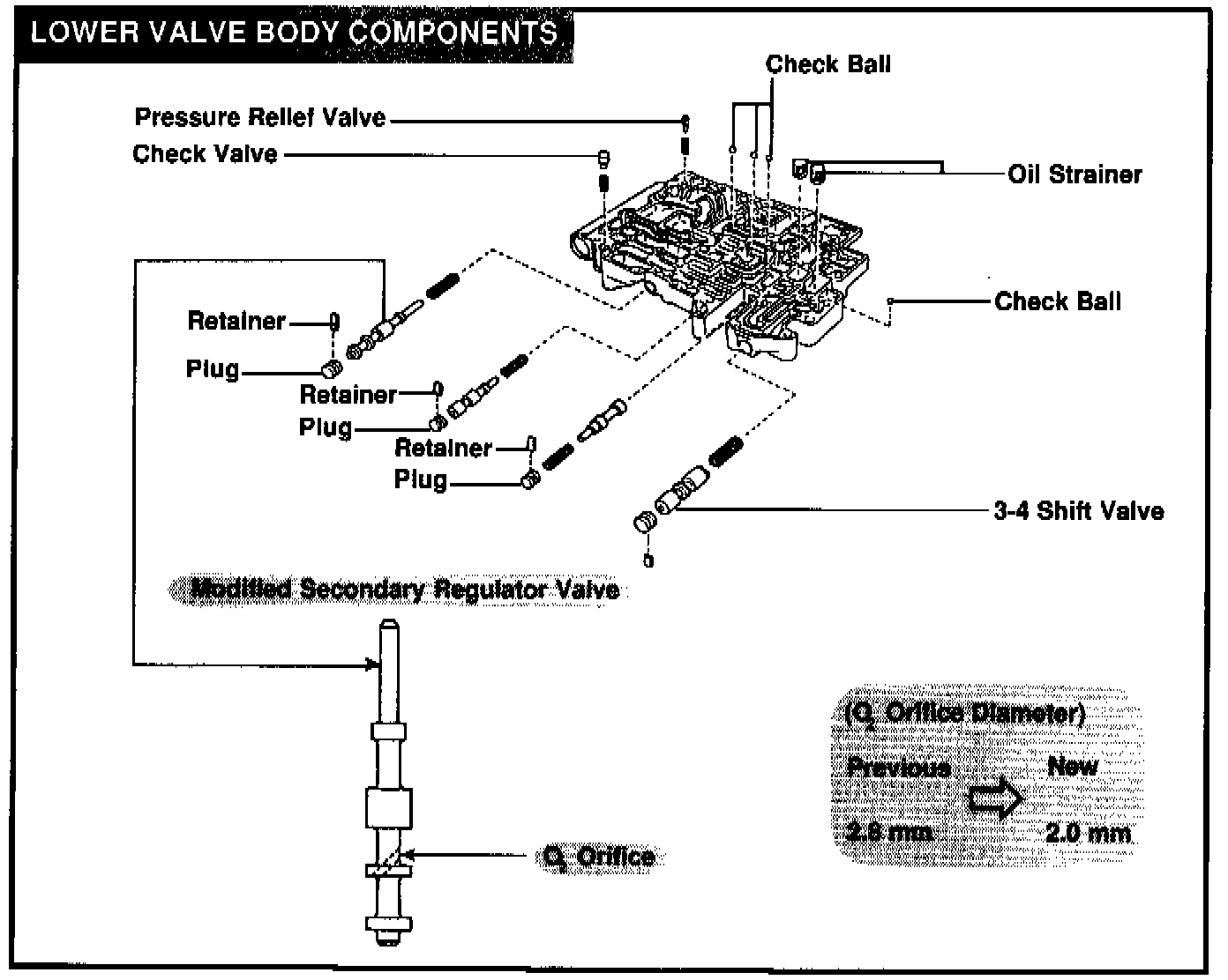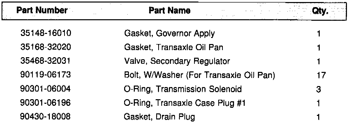 To repair affected transaxles, the secondary regulator valve is available as a kit (P/N 04354-32010) which includes the parts: