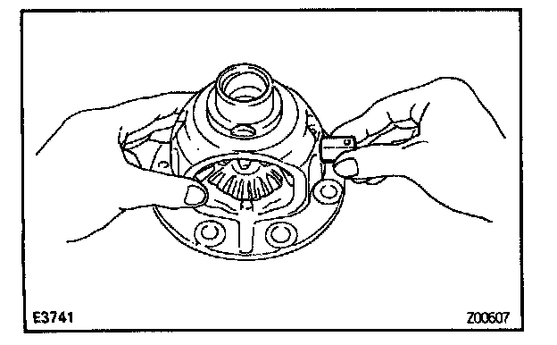 Measure the side gear backlash while holding one pinion gear toward the case.