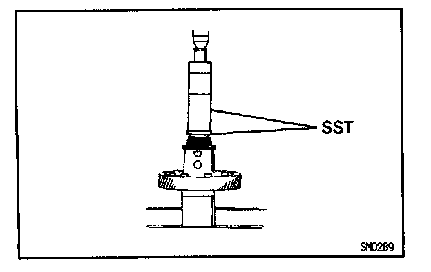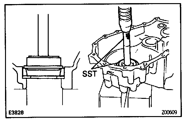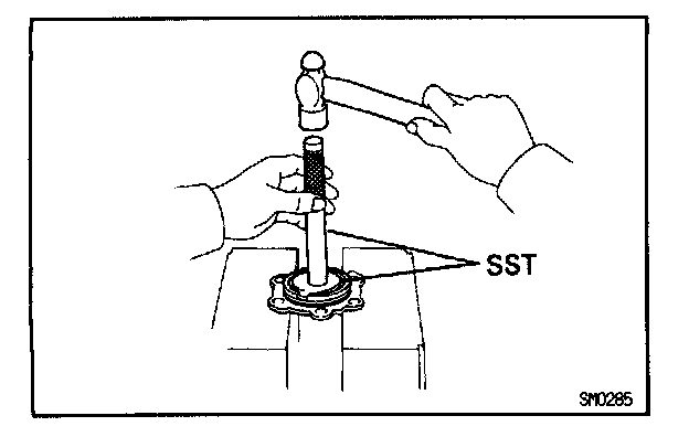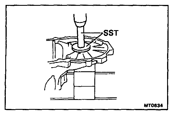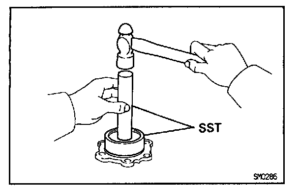 b. Using SST and a hammer, drive in a new oil seal until its surface is flush with the case surface.