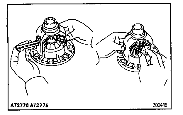 a. Install the correct thrust washers and side gears. Referring to the image, select thrust washers which will ensure that the backlash is within specification. Try to select washers of the same size for both sides.