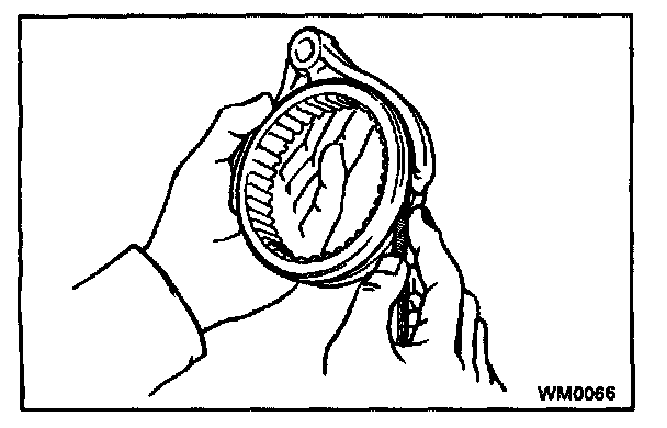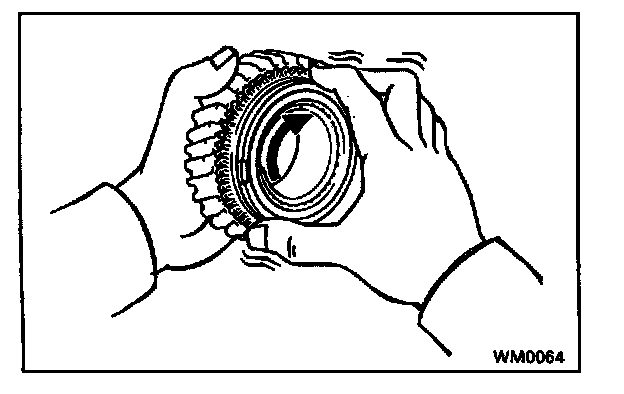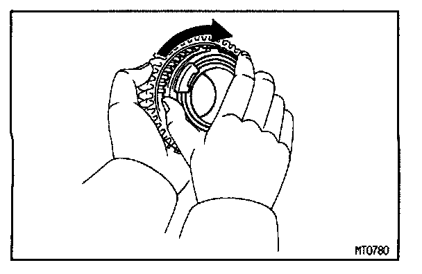 b. Check the braking effect of the synchronizer ring. Turn the synchronizer ring in one direction while pushing it to the gear cone. Check that the ring locks.