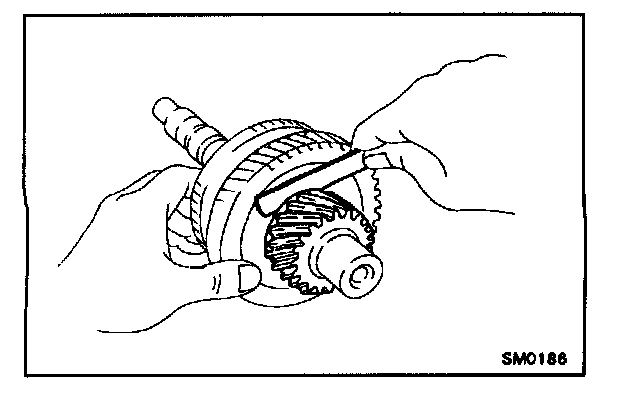d. Using a feeler gauge, measure the clearance between the synchronizer ring back and the gear spline end.