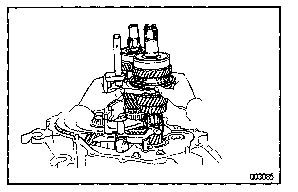 Install the input and output shaft assembly together with the No.1 fork shaft, shift head and shift forks with the interlock pin to the transaxle case.