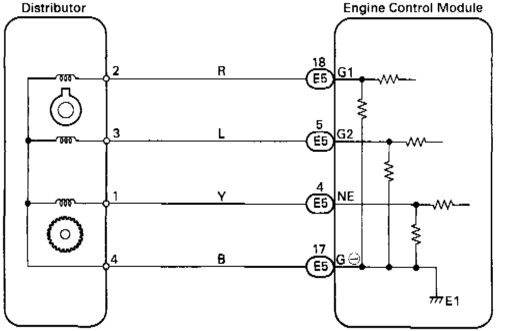 The distributor in the engine control system contains 3 pick-up coils (G1, G2 and NE).