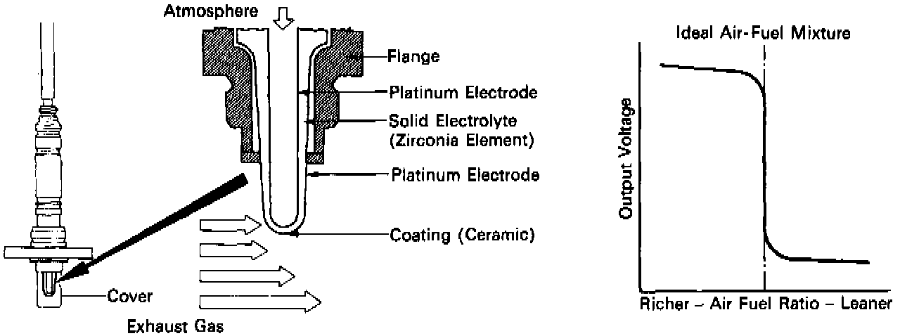 The oxygen sensor has the characteristic whereby its output voltage changes suddenly in the vicinity of the stoichiometric air-fuel ratio. This characteristic is used to detect the oxygen concentration in the exhaust gas and provide feedback to the computer for control of the air-fuel ratio.