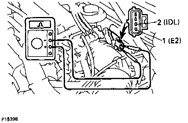 c. Measure resistance between terminals 2 (IDL) and 1 (E2) of throttle position sensor connector.