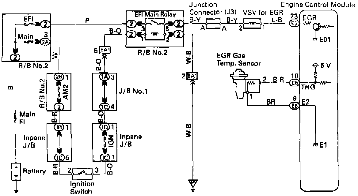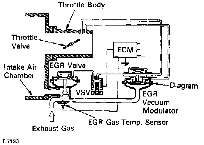 The EGR system recirculates exhaust gas, which is controlled to the proper quantity to suit the driving conditions, into the intake air mixture to slow down combustion, reduce the combustion temperature and reduces NOx emissions. The amount of EGR is regulated by the EGR vacuum modulator according to the engine load.