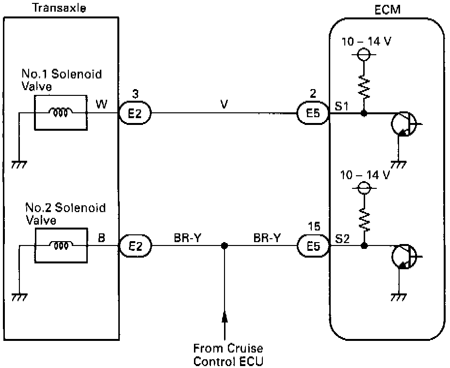 Shifting from 1st to O/D is performed in combination with ON and OFF of the No.1 and No.2 solenoid valves controlled by the engine control module (ECM). If an open or short circuit occurs in either of the solenoid valves, the ECM controls the remaining normal solenoid to allow the vehicle to be operated safety (see Fail Safe Function).