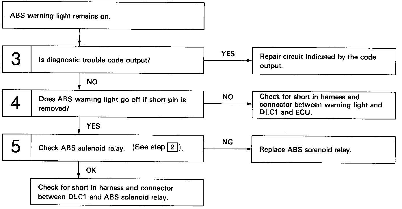 If the ECU detects trouble, it lights the ABS warning light while at the same time prohibiting ABS control. At this time, the ECU records a diagnostic trouble code in memory. After removing the short pin of the DLC1 connect terminals Tc and E1 of DLC1 to make the ABS warning light blink and output the diagnostic trouble code.