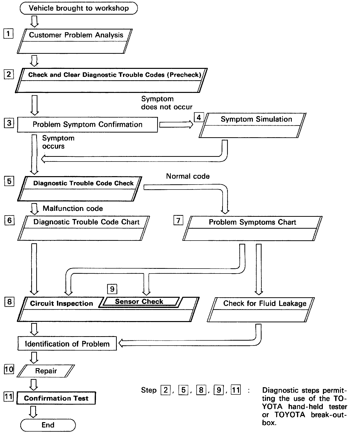Check the diagnostic trouble codes. If a malfunction code is output, proceed to "6 Diagnostic Trouble Code Chart". If the normal code is output, proceed to "7 Problem Symptoms Chart". Be sure to proceed to "6 Diagnostic Trouble Code Chart" after steps 2 and 3 are completed. If troubleshooting is attempted only by following the malfunction code stored in the memory, errors could be made in the diagnosis.