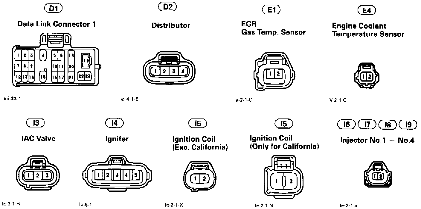 DLC1, distributor, EGR gas temperature sensor, engine coolant temperature sensor, idle air control valve, igniter, ignition coil, injectors # 1 and 4.