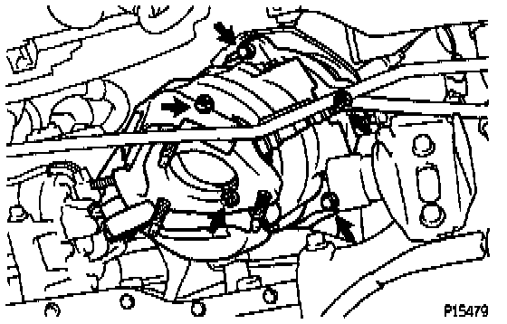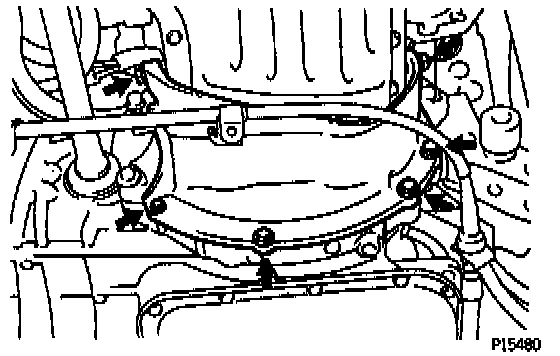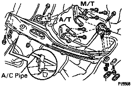 5. A/T only: Remove the 2 bolts. and disconnect the transaxle control cable from engine mounting center member.