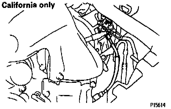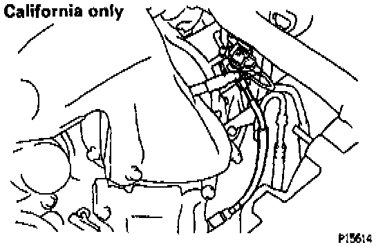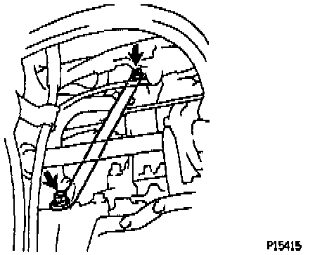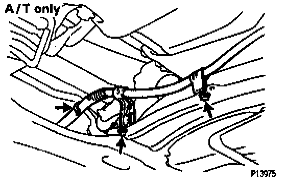 6. A/T only: Install the transaxle control cable to engine mounting center member with the 2 clamps and 2 bolts.