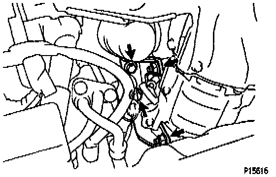 h. Tighten the bolt and 2 nuts holding the rear engine mounting insulator to the front suspension member.