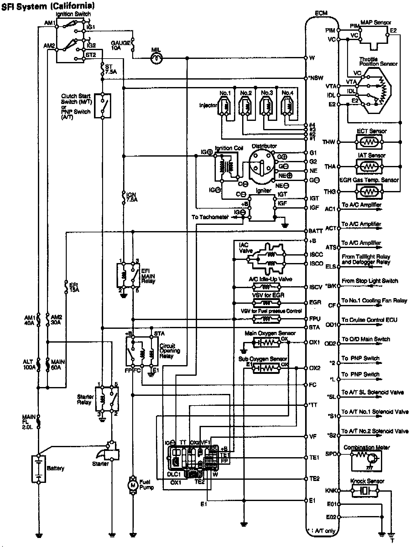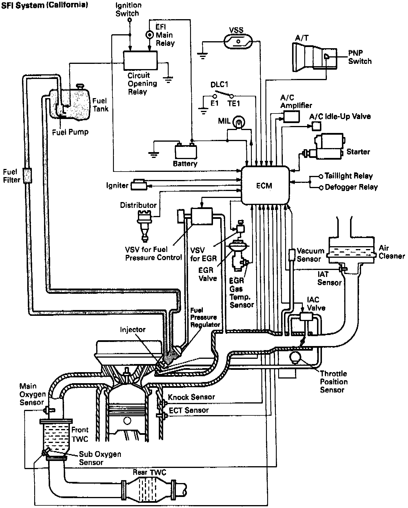This engine is equipped with a TOYOTA Computer Controlled System (TCCS) which centrally controls the Sequential Multiport Fuel Injection (SFI), Electronic Spark Advance (ESA), Idle Air Control (IAC) and Diagnosis systems etc. by means of an ECM (formerly MFI computer) employing a microcomputer.