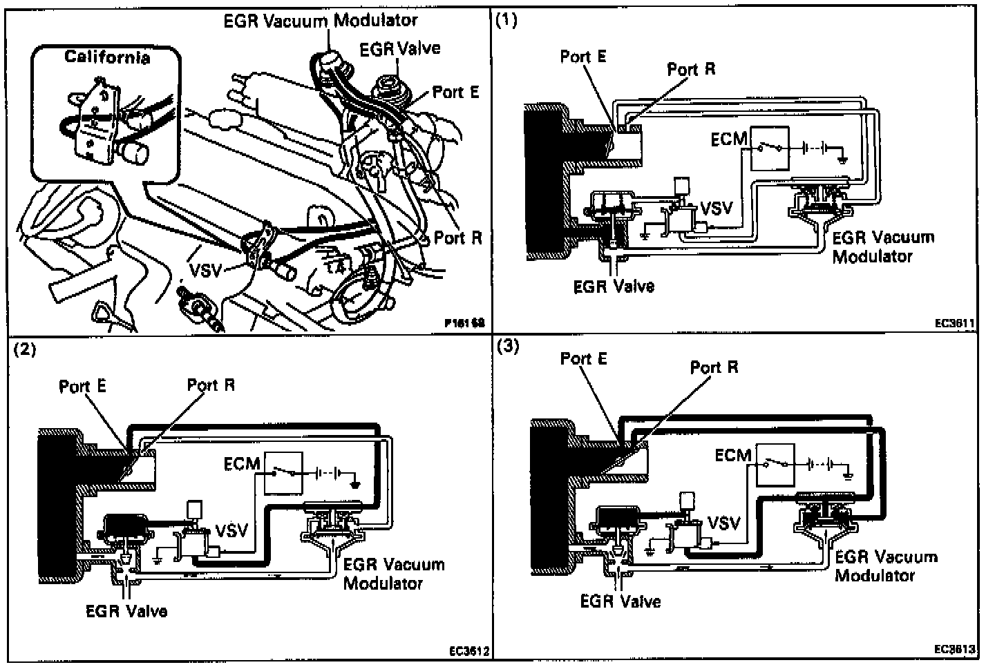When the throttle plate is positioned between port E and port R, the engine speed is below 4000 rpm, the engine coolant temperature is above 53° C (127° F) and the EGR vacuum switching valve is ON, exhaust gas pressure causes the atmospheric passage inside the EGR vacuum modulator to CLOSE and allows the vacuum signal from port E to be passed to the EGR valve. This causes the exhaust pressure to drop, which allows the vacuum modulator to OPEN, stopping the vacuum signal to the EGR valve. When the EGR valve closes the exhaust gas pressure again increases, closing the atmospheric passage inside vacuum modulator to CLOSE and passing the vacuum signal to the EGR valve. This cycle continues as long as conditions remain within a predetermined range.