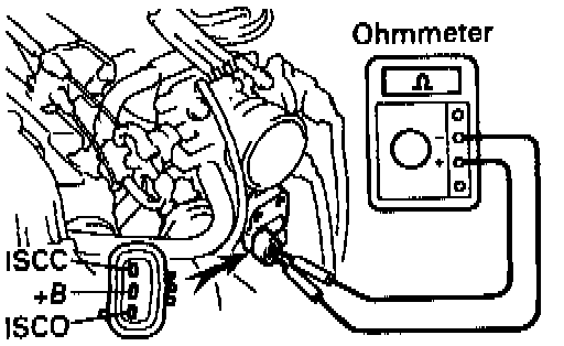 (b) Using an ohmmeter, measure the resistance between terminal +B and other terminals (ISCC, ISCO).