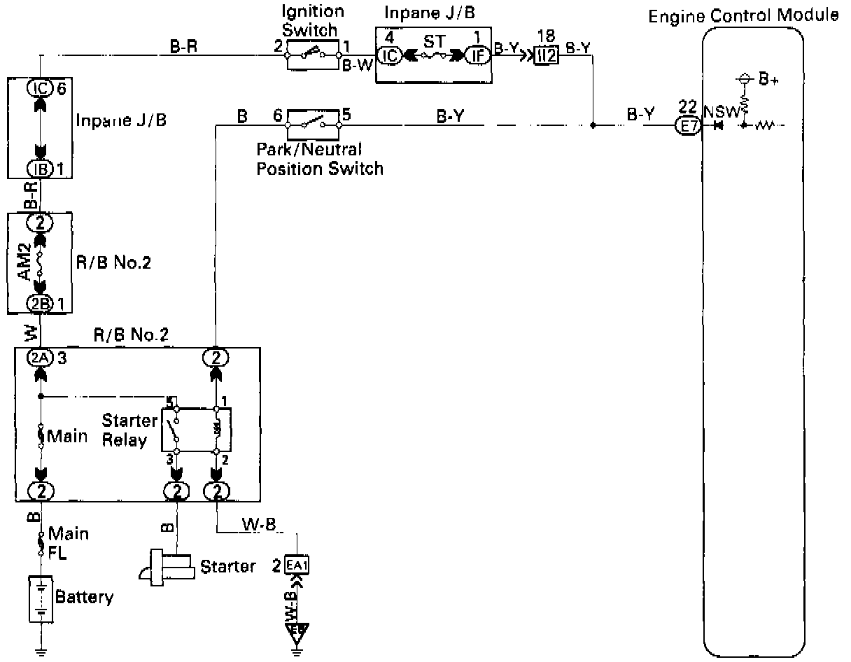 The park/neutral position switch goes on when the shift lever is in the N or P shift position. When it goes on the terminal NSW of the engine control module (ECM) is grounded to body ground via the starter relay and theft deterrent ECM, thus the terminal NSW voltage becomes 0V. When the shift lever is in the D, 2, L or R position, the park/neutral position switch goes off, so the voltage of ECM terminal NSW becomes battery positive voltage, the voltage of the ECM internal power source.