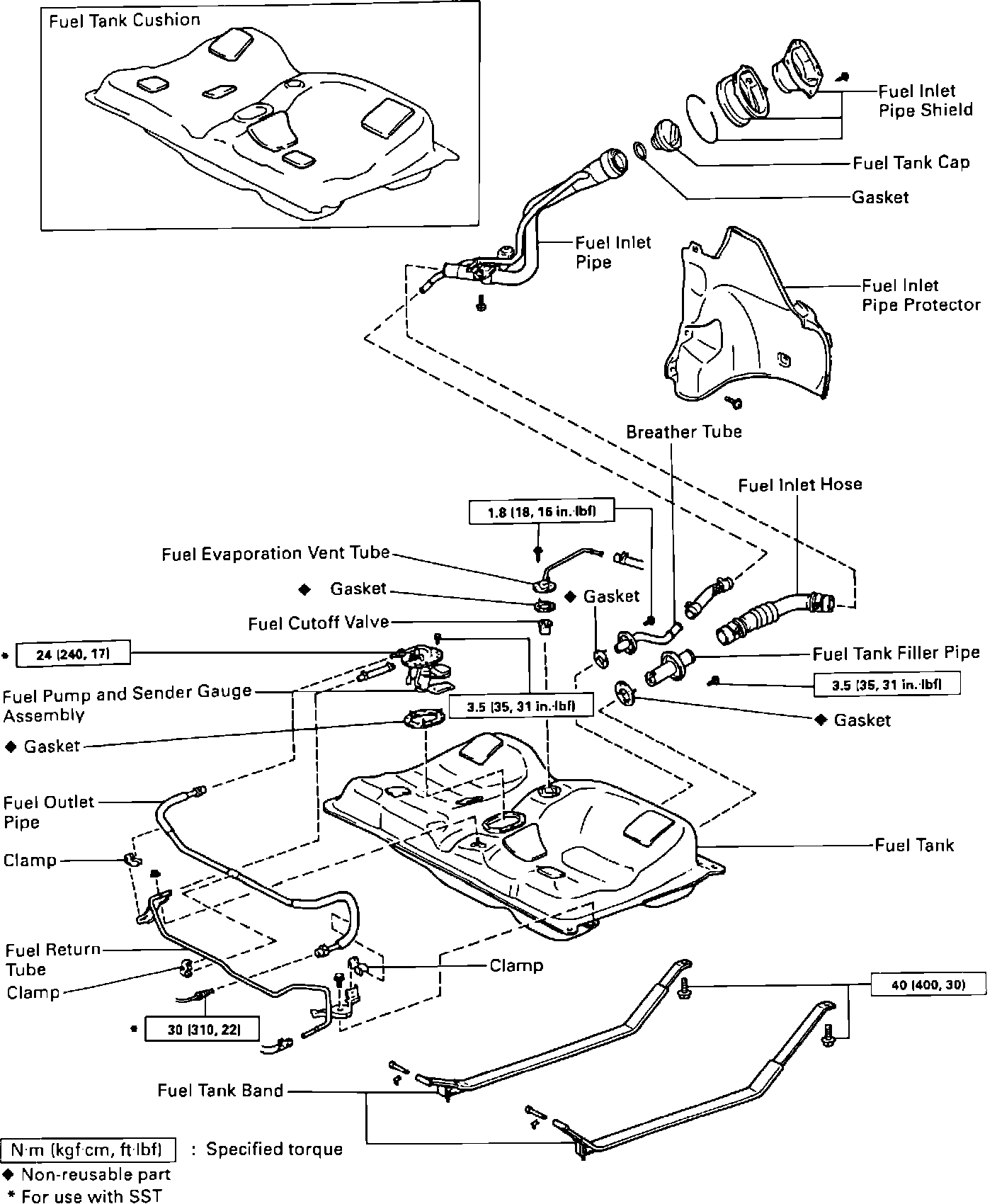 Refer to illustration for Fuel Tank removal, noting all torque values during reassembly.