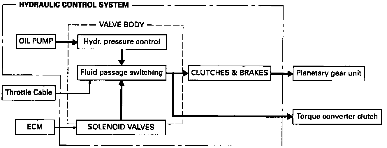 The hydraulic control system is composed of the oil pump, the valve body, the solenoid valves, the accumulator, the clutches and brakes, and the governor valve as well as the fluid passages which connect all of these components.