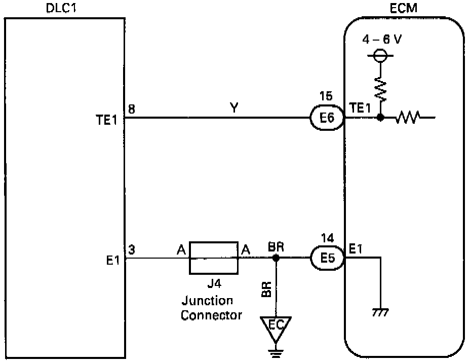 CIRCUIT DESCRIPTIONThe engine control module (ECM) displays data trouble codes (DTC) using the "0/D OFF" indicator light when terminals TE1 and E1 of the data link connector 1 (DLC1) are connected.