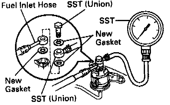(d) Install the fuel inlet hose and SST (pressure gauge) to the Fuel Filter with 3 new gaskets and union bolt (SST 09268-45012).