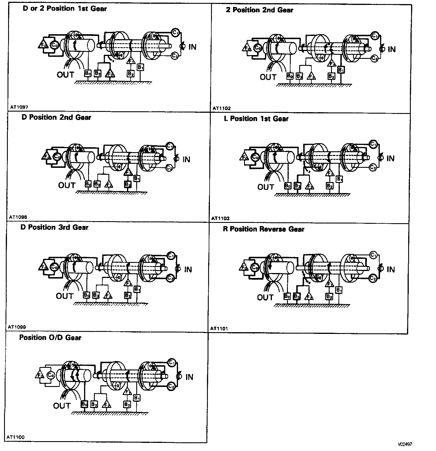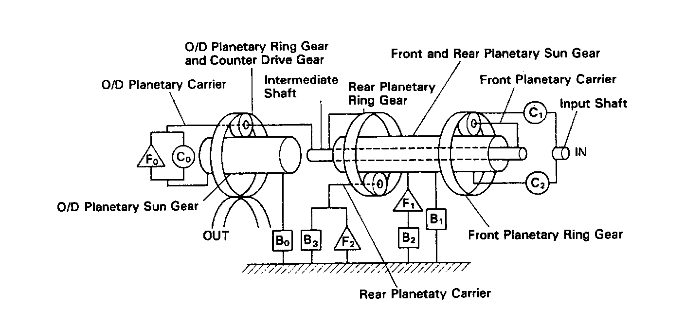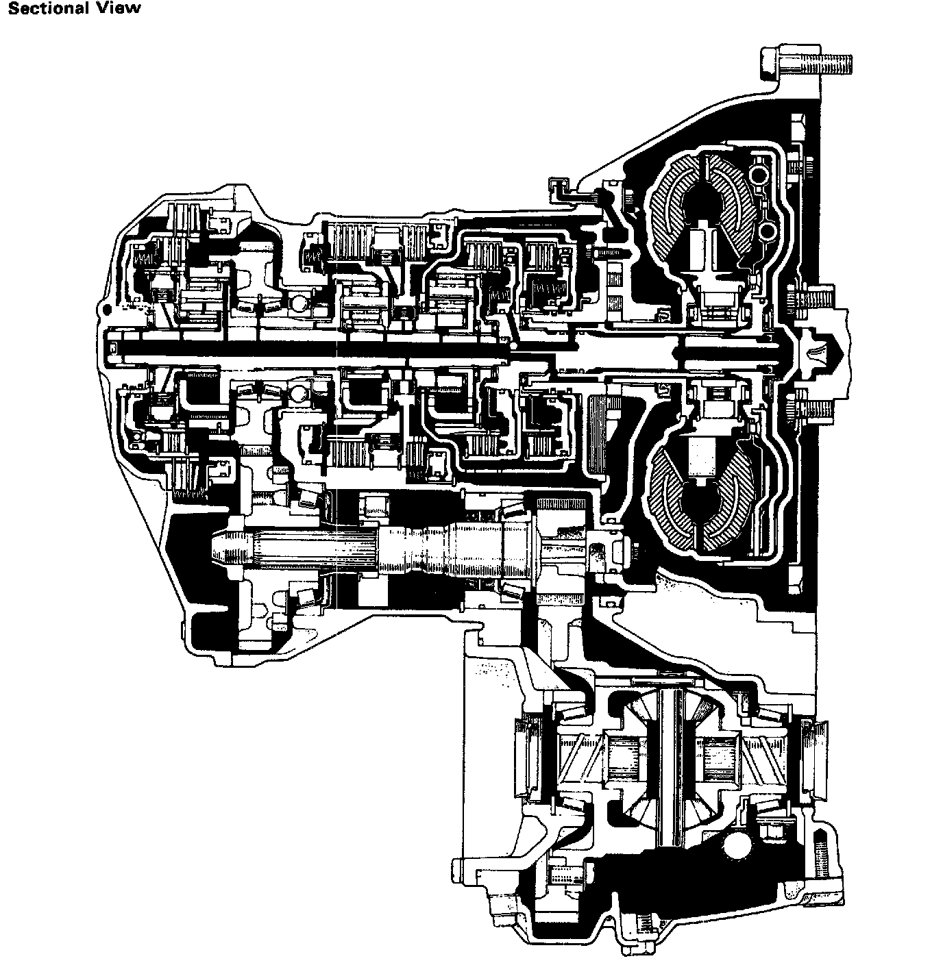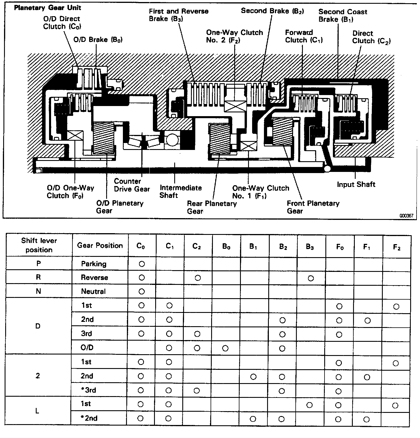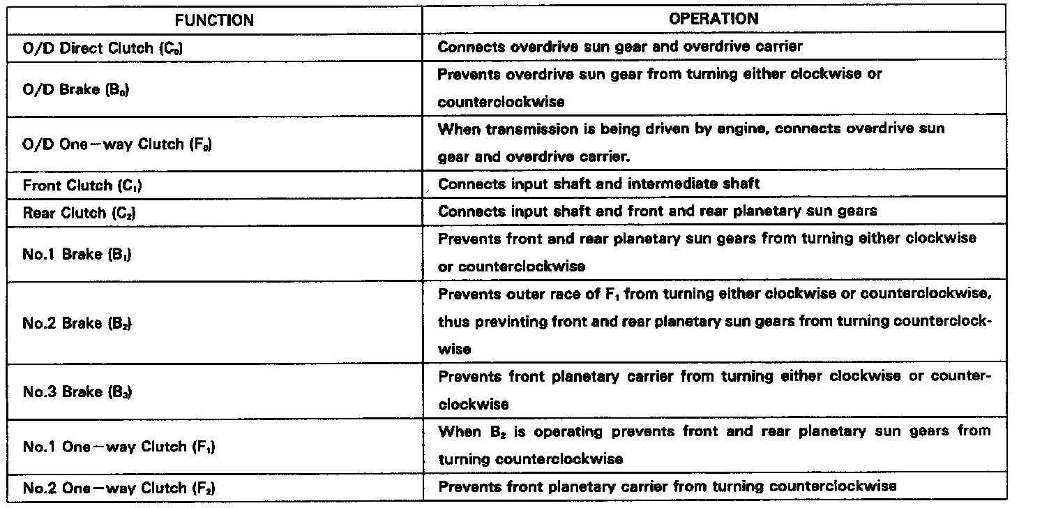Power from the engine transmitted to the input shaft via the torque converter is then transmitted to the planetary gears by the operation of the clutch. By operation of the brake and one-way clutch, either the planetary carrier or the planetary sun gear are immobilized, altering the speed of revolution of the planetary gear unit. Shift change is carried out by altering the combination of clutch and brake operation. Each clutch and brake operates by hydraulic pressure; gear position is decided according to the throttle opening angle and vehicle speed, and shift change automatically occurs. The conditions of operation for each gear position are shown in the illustrations.