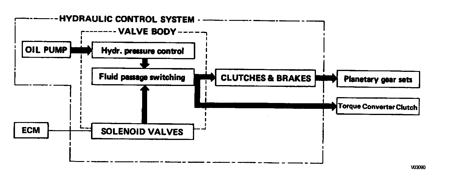The hydraulic control system is composed of the oil pump, the valve body, the solenoid valves, the accumulators, the clutches and brakes, and the governor valve as well as the fluid passages which connect all of these components. Based on the hydraulic pressure created by the oil pump, the hydraulic control system governs the hydraulic pressure acting on the Torque Converter Clutch (TCC), clutches and brakes in accordance with the vehicle driving conditions. There are three solenoid valves on the valve body. The No.1 and No.2 solenoid valves are turned on and off by signals from the Engine Control Module (ECM) to operate the shift valves and change the gear shift position. The No.3 solenoid valve is operated by signals from the ECM to engage or disengage the lock-up clutch of the torque converter.