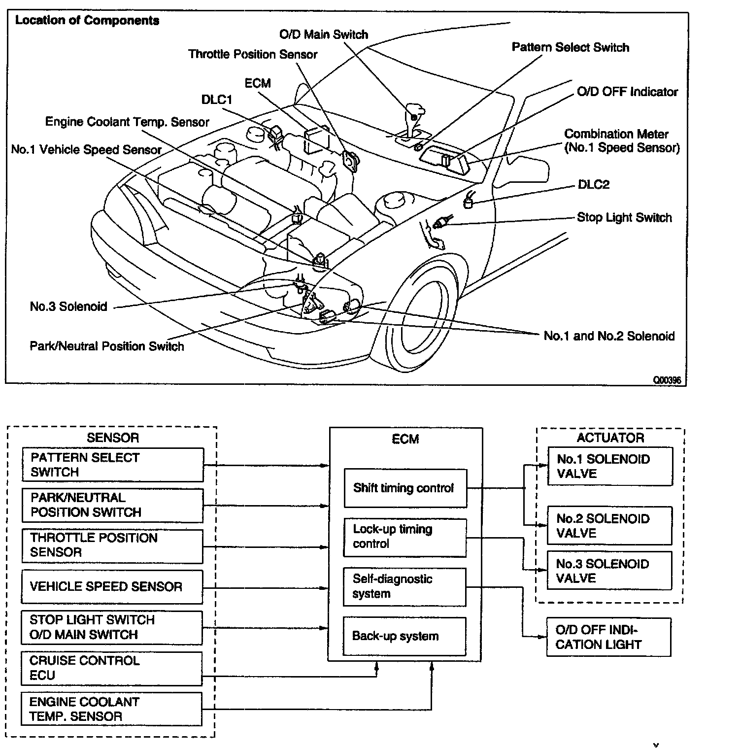 The electronic control system for controlling the shift timing and the operation of the lock-up clutch is composed of the following 3 parts: