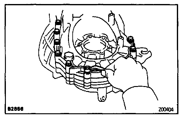 Using a snap ring expander, remove the 2 snap rings.
