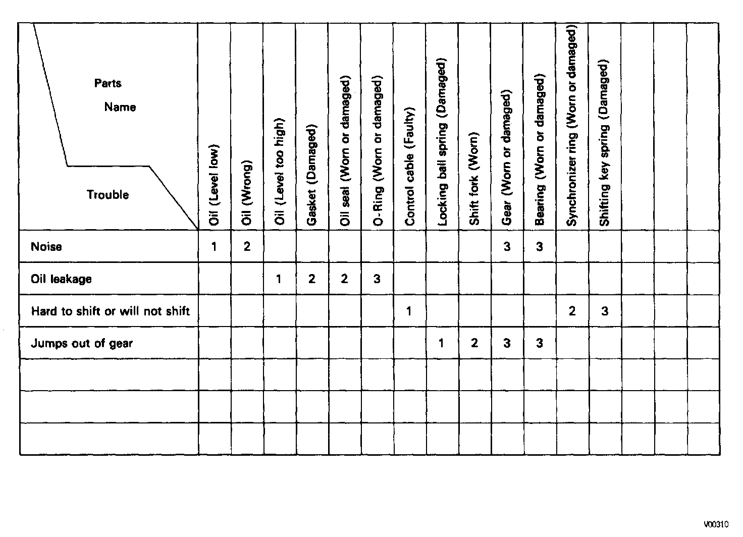Use the table below to help you find the cause of the problem. The numbers indicate the priority of the likely cause of the problem. Check each part in order. If necessary, replace these parts.