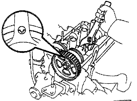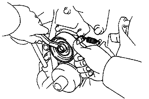 (c) Hold the hexagonal wrench head portion of the camshaft with a wrench and tighten the timing pulley bolt.