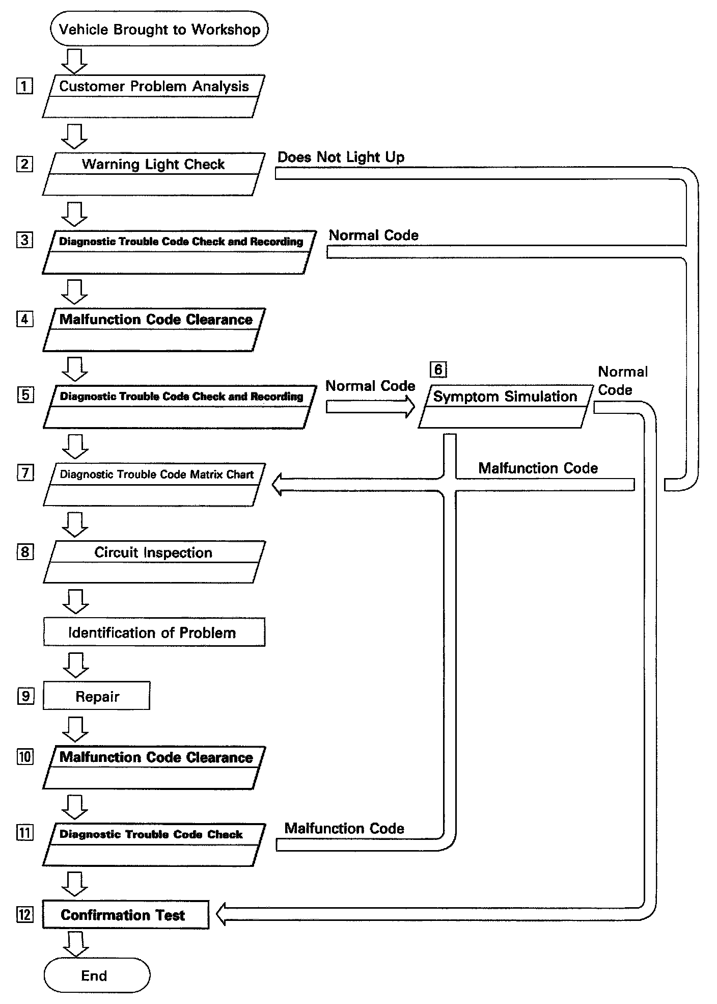 Steps 3, 4, 5, 10, 11, 12: Diagnostic steps permitting the use of the TOYOTA hand-held tester.