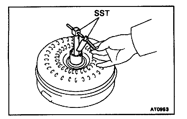 (b) Install SST so that it fits in the notch of the converter hub and outer race of the one-way clutch.