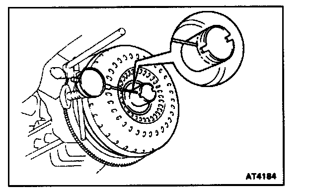 Temporarily mount the torque converter clutch to the drive plate. Set up a dial indicator.
