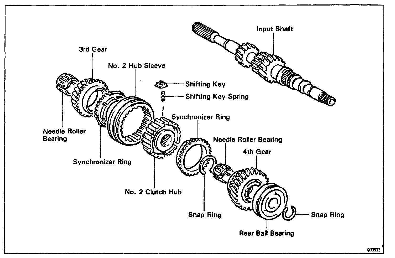 4. REMOVE REAR BALL BEARING, 4TH GEAR, NEEDLE ROLLER BEARING, SPACER AND SYNCHRONIZER RING FROM INPUT SHAFT