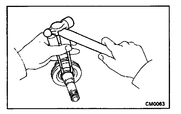 Using 2 screwdrivers and a hammer, tap out the snap ring.