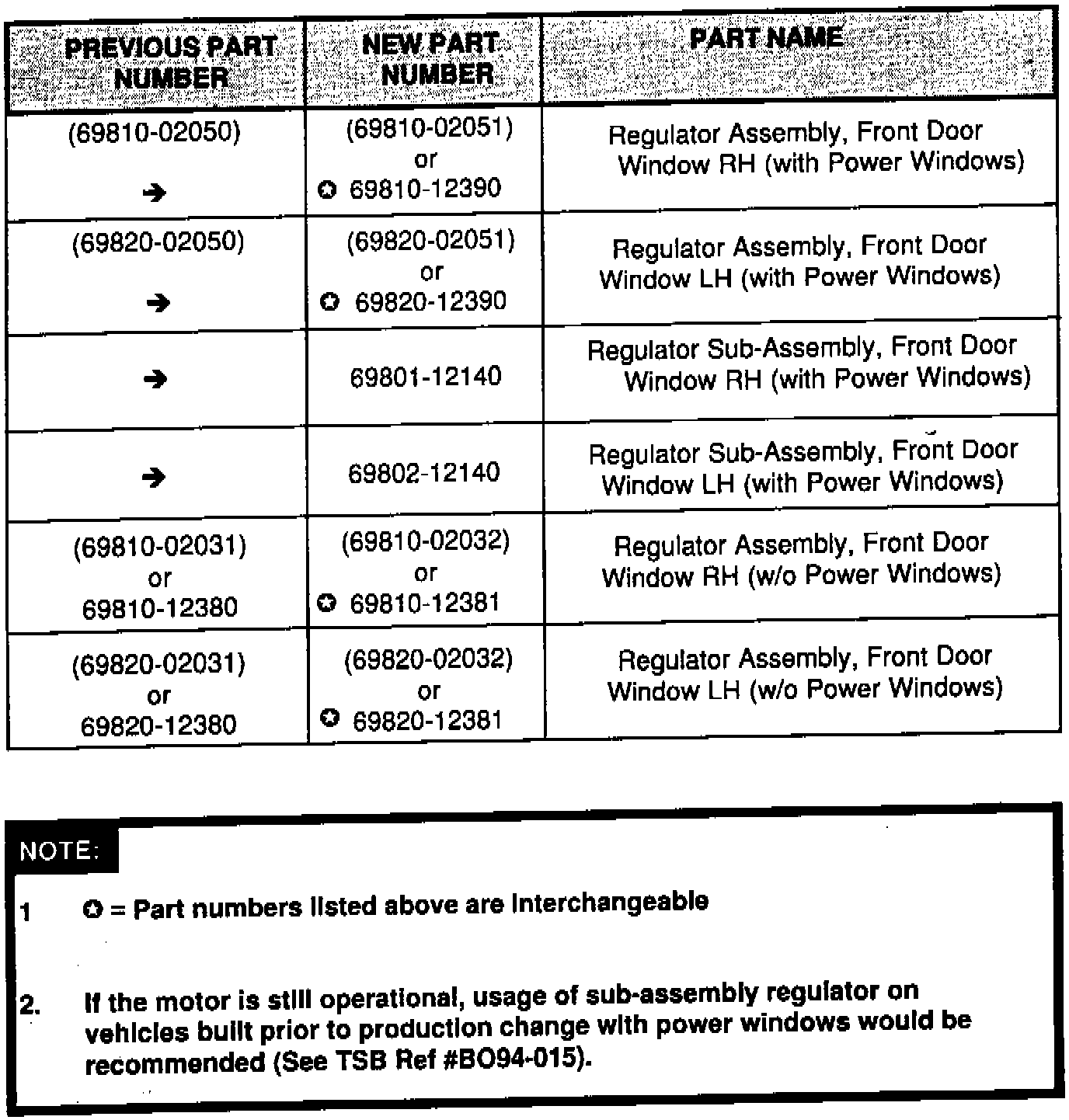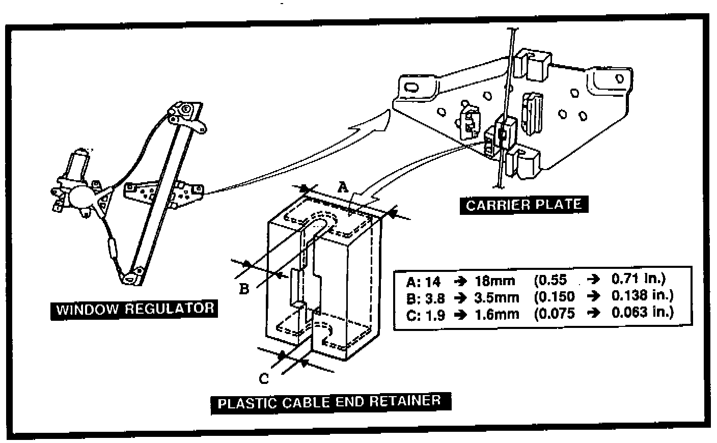 To improve the operation of the window regulator, the shape of the carrier plate and plastic cable end retainer have been changed as shown.