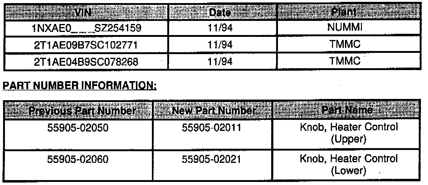 To improve retention of the Heater Control Knobs on North American built Corollas, a production change has been made. The inner dimension of the knob has been modified to provide an audible "click" when installed properly.