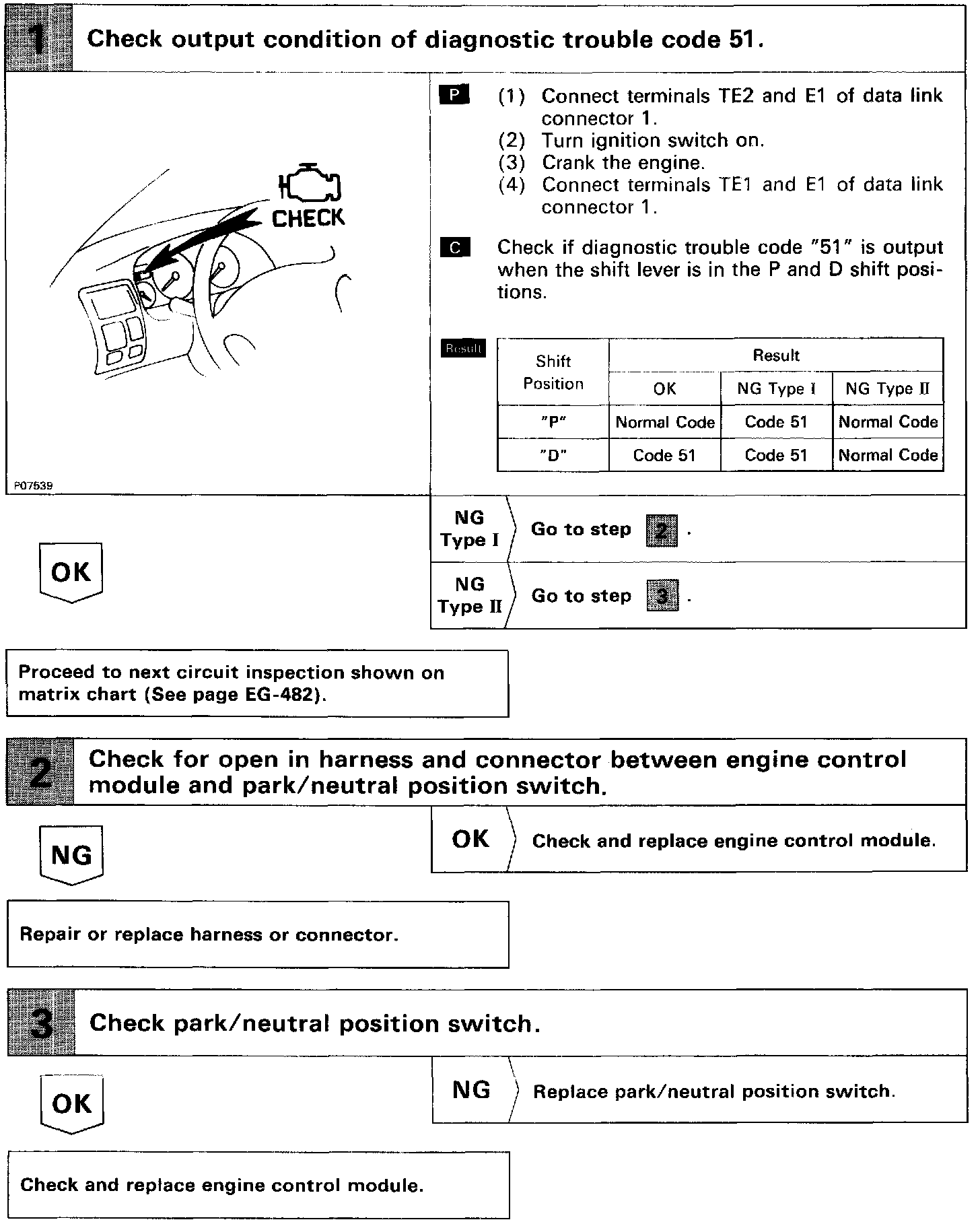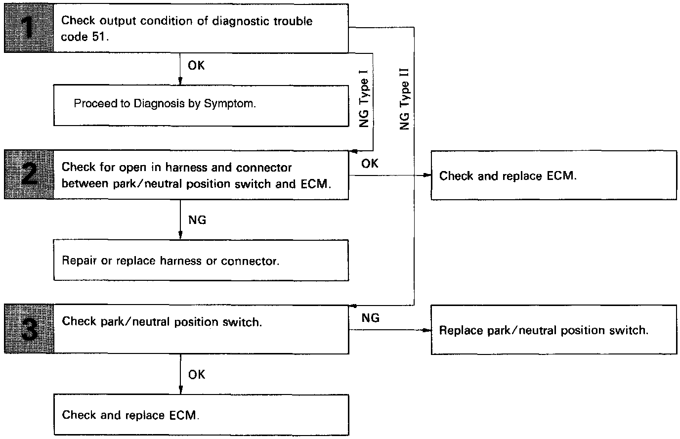 - When the park/neutral position switch is off, code "51" is output in the test mode diagnosis. (This is not abnormal.)
