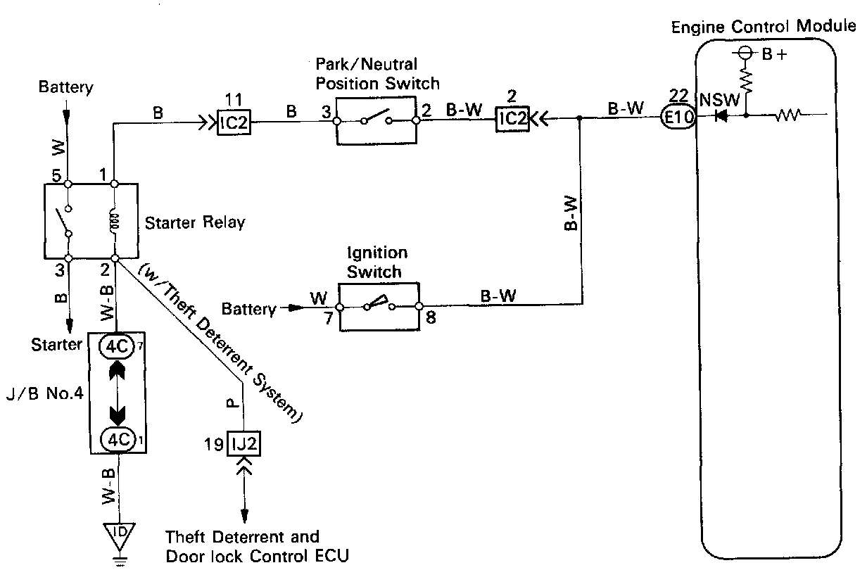 - The park/neutral position switch goes on when the shift lever is in the N or P shift position. When it goes on the terminal NSW of the ECM is grounded to body ground via the starter relay and theft deterrent ECM, thus the terminal NSW voltage becomes 0V. When the shift lever is in the D, 2, L or R position, the park/neutral position switch goes off, so the voltage of ECM terminal NSW becomes battery positive voltage, the voltage of the ECM internal power source.- If the shift lever is moved from the N position to the D position, this signal is used for air-fuel ratio correction and for idle speed control (estimated control), etc.