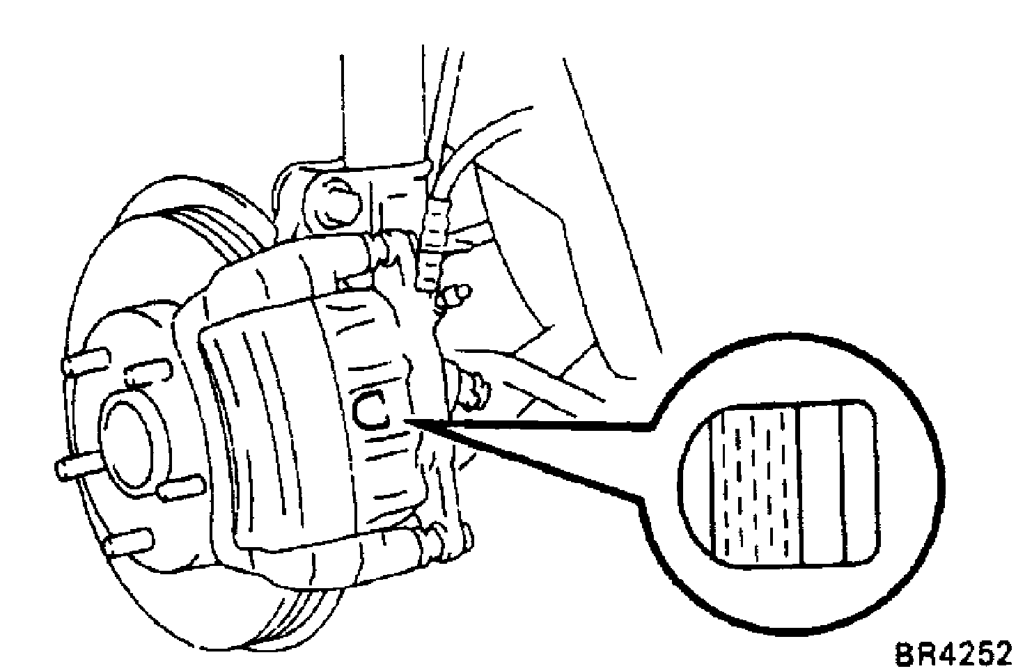 Check the pad thickness through the cylinder inspection hole and replace the pads if not within specification.