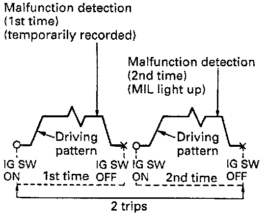 - Diagnostic trouble codes 25, 26 and 71 use "2 trip detection logic". With this logic, when a malfunction is first detected, the malfunction is temporarily stored in the ECM memory. If the same case is detected again during the second drive test, this second detection causes the MIL to light up.