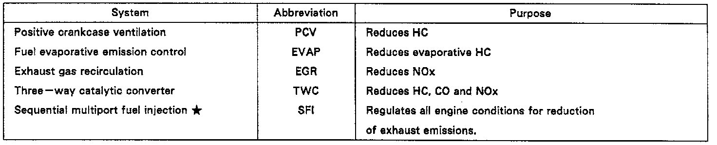 The table above lists the emission control sub-systems used on this vehicle and the purpose of each.