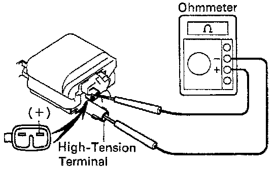 - Using an ohmmeter, measure the resistance between the positive (+) and high-tension terminals.