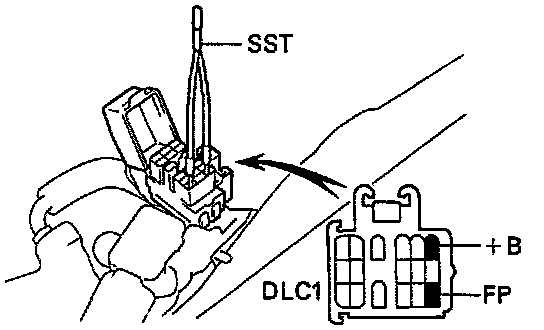- Using a jumper wire (or SST 09843-18020), connect terminals +B and FP of the DLC1.