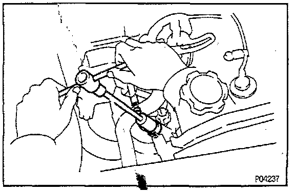 - After checking fuel pressure, disconnect the negative (-) terminal cable from the battery and carefully remove the pressure gauge to prevent gasoline from spraying.
