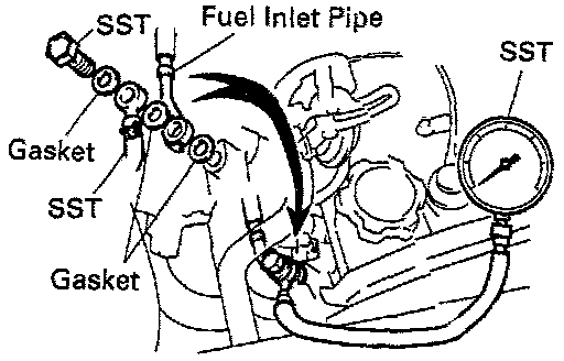 - Install the fuel inlet hose and SST (pressure gauge) to the delivery pipe with 3 gaskets and SST (union bolt).
