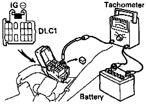 - Connect the tester probe of a tachometer to terminal IG(-) of the DLC1.